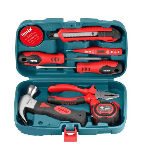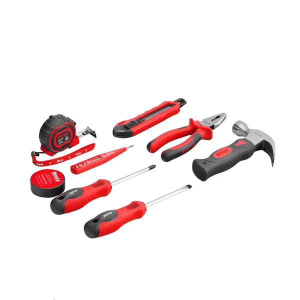 شرح ابزارها: متر 3m*19mm، کاتر 18*100mm، فاز متر 13cm*1.8cm، پیچ گوشتی PH2*100mm، پیچ گوشتی SL6*100mm، انبردست 6"، نوار چسب عایق 0.15mm*17mm*5m ، چکش دسته کوتاه 16 اینچی 165mm