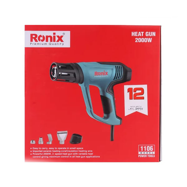 سشوار صنعتی RONIX مدل 1106 با انتقال گرما به قطعات کاری مورد نظر، آنها را خشک یا کمی نرم برای فرم دهی و تغییر شکل اجسام به کار می رود. معمولا سشوارهای صنعتی تعدادی اقلام همراه داشته که هر یک کاربرد خاص خود را دارد. سشوار صنعتی 1106 به همراه 4 عدد نازل به فروش می رسد. نازل مخروطی شکل برای متمرکز کردن حرارت در یک نقطه به کار می رود. نازل بازتابنده از این سری برای تغییر شکل استفاده می شود چرا این نازل حرارت را به دور قطعه کار پخش می کند. نازل بعدی به نازل فلت معروف بوده که کاربرد زیادی در تمامی کارها مانند چسباندن، کارهای تزییناتی، جوشکاری و وکیوم کاری و غیره کاربرد دارد. نازل آخر عملکردی مانند نازل مخروطی داشته اما کمی کوتاه تر است.