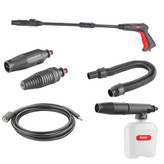کوپلینگ اتصال سریع، رابط ورودی آب، نازل توربو، نازل قابل تنظیم، شلنگ 5 متری فشار قوی PVC، مخزن مواد شوینده، تفنگ آبپاش فشار قوی، سری گوشهگیر، برس مخصوص مبلمان، لوله خرطومی