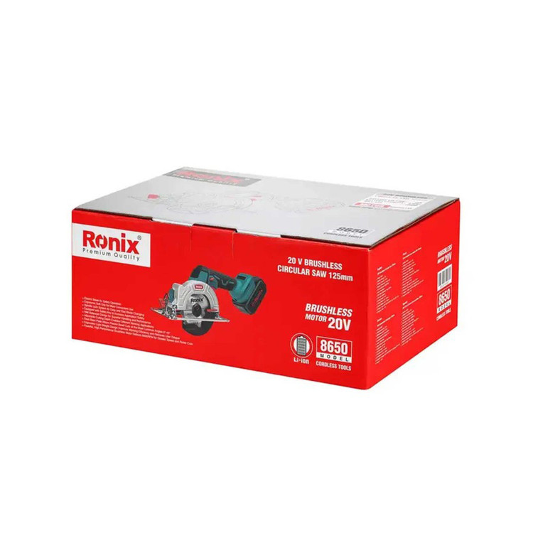 اره گردبر شارژی دستی 8650 در جعبه رنگی رونیکس همراه با یک عدد آچار آلن، یک عدد گونیا، یک عدد باتری 4 آمپر ساعت و یک عدد شارژر 4 آمپری به بازار ابزار ایران عرضه میشود.