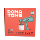 پیستوله برقی 500 وات روماتون، سیستم رنگپاشی HVLP را اجرا میکند که در لغت به معنای «حجم بالا، فشار کم» است. در این سیستم، رنگ با غلظت بیشتر توسط فشار کمتر هوا پاشش میشود. براساس این نوع کارکرد، هوای فشرده به رنگ داخل مخزن وارد شده و پس از اتمیزه شدن یا تبدیل به ذزات بسیار ریز، توسط نازل و بهوسیلة اسپری گان، به سطح مورد نظر میپاشد. بنابراین با توجه به حجم بیشتر رنگ عبوری، برای این نوع پیستوله رنگ میبایست از مجاری و نازلهایی با سایز بزرگتر استفاده شود. همچنان که نازل تعبیه شده برای پیستوله برقی 500 وات روماتون، دارای سایز 2/6 است.