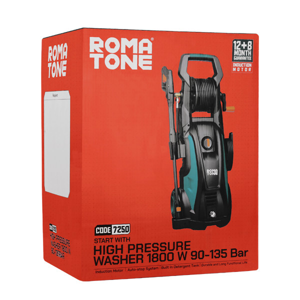 کارواش 135 بار دینامی 1800 وات روماتون، همراه با لوازم جانبی از جمله تفنگی (گان)، لنس، سری واتر جت، شلنگ، مخزن مایعات شوینده، کوپلینگ (تبدیل اتصال) و فیلتر شیشهای قابل تهیه است.