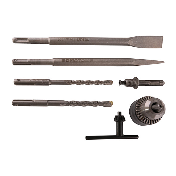 بتن کن نیمتنه فلزی 1000 وات روماتون، دارای لوازم جانبی از قبیل کیف برزنتی قلم، زغال اضافه، ست تبدیل بتنکن به دریل، دو عدد قلم نوک تیز و تخت، دستة کمکی ضد تعریق، خطکش تنظیم عمق و یک جفت دستکش مخصوص کار با دستگاه و در یک کیف BMC قابل تهیه است.