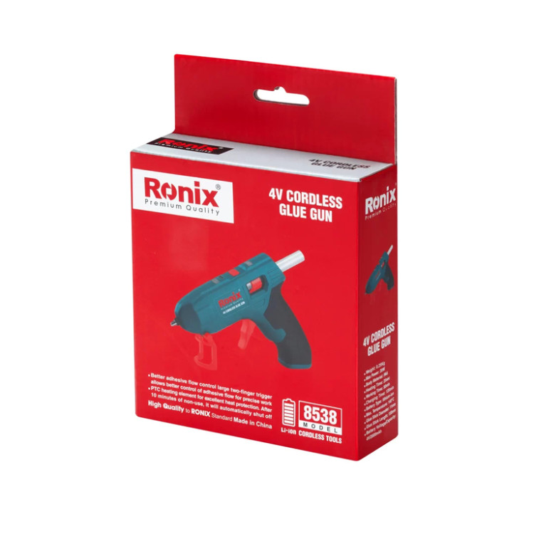 چسب حرارتی شارژی 4 ولت رونیکس مدل 8538 در جعبه رنگی رونیکس به همراه کابل شارژر و 2 عدد چسب به بازار ابزار ایران عرضه میشود.