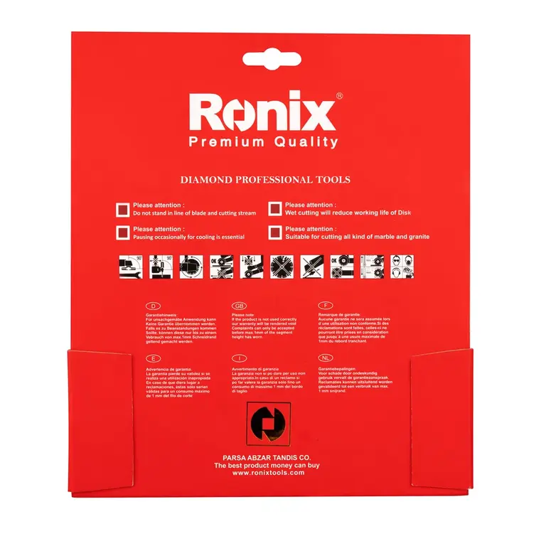 رونیکس تاکنون ابزارآلات، متعلقات و قطعات متعددی را تولید کرده است و صفحات گرانیتبر، نمونهای از متعلقات ابزارآلات برشی این شرکت هستند. صفحه گرانیتبر 230 میلیمتری رونیکس با مدل 3510-RH، مناسب برای فرز و دستگاههای برش سنگ بوده، از دوام و کیفیت برش بالایی برخوردار است و انواع گرانیت و سنگ مرمر را با کیفیت و سرعت بالایی برش میدهد.