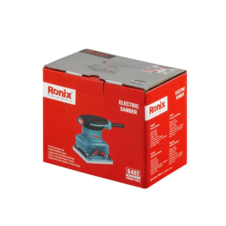 سنباده لرزان برقی مشتی 220 وات رونیکس مدل 6402 در جعبه رنگی رونیکس همراه با یک صفحه سنباده، پد اسفنجی به بازار ابزار ایران عرضه میشود.