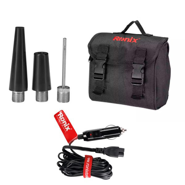 ارائهشده در کیف برزنتی رونیکس همراه با 3 متر سیم رابط فندکی، 3 متر شلنگ، یک عدد نازل باد توپ، یک عدد مبدل باد تایر، یک عدد مبدل باد تشک بادی